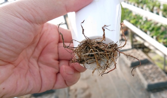 ここまで根が張れば大丈夫。子株を固定するためのUピンは取り除きます。